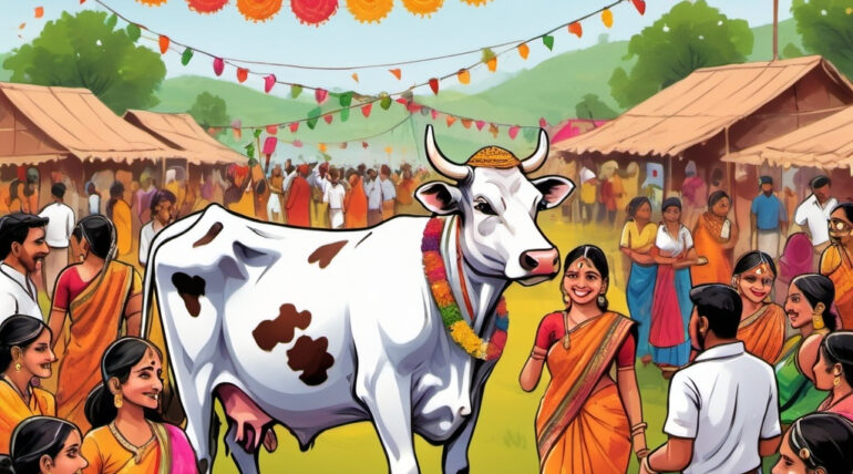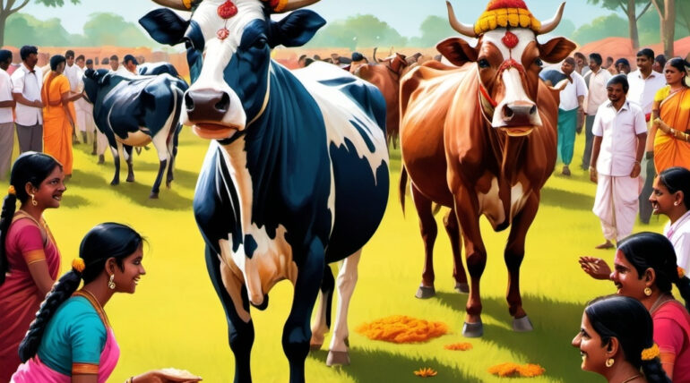 Tale: In the southern state of Tamil Nadu, the four-day Pongal festival is a time of joy, gratitude, and worship, with the third day, Mattu Pongal, dedicated entirely to cows. As dawn breaks, farmers lovingly wash their cows, paint their horns, and adorn them with vibrant garlands. These cows are more than livestock; they are considered family, and their role in ensuring a bountiful harvest is celebrated with reverence.