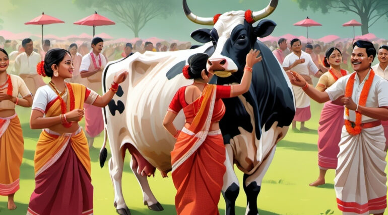 The cow, as a symbol of prosperity and fertility, is honored with rituals that emphasize its importance in Assamese culture. The festival reflects the deep respect for cows as providers and protectors of the land.