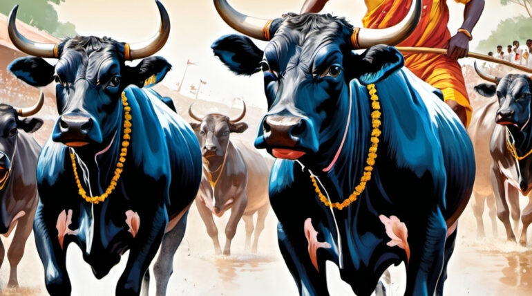 Tale: In the coastal regions of Karnataka, the Kambala festival is a thrilling spectacle where buffaloes, and often cows, race across muddy tracks, cheered on by enthusiastic crowds. While Kambala is known for its buffalo races, cows are equally revered during this time. These animals, vital to the agricultural communities, are celebrated for their strength, endurance, and contribution to farming.